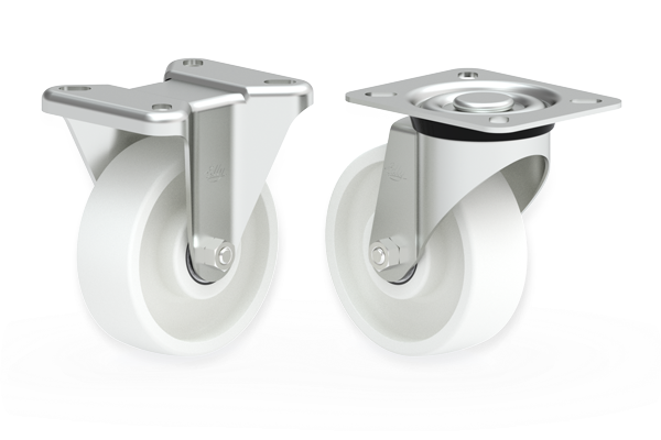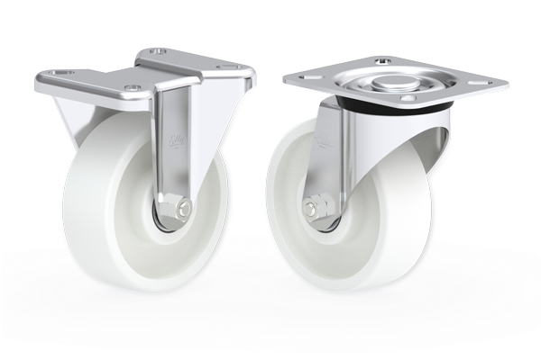 NBA Castors Stainless steel framed fixed and swivel castors. Nylon wheels with precision ball bearings. Wheels available in ø80mm (3"), ø100mm (4") and ø125mm (5") |