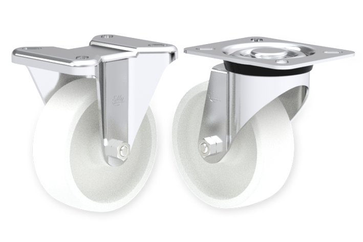 NA Castors Stainless steel framed fixed and swivel castors with nylon wheels. Wheels available in ø80mm (3"), ø100mm (4") and ø125mm (5") |